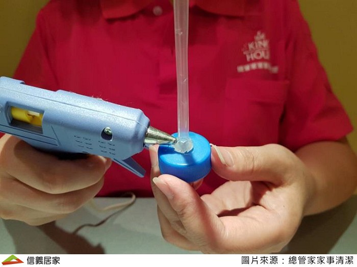 Step3.吸管穿入瓶蓋,但不需太長,用熱熔膠密封瓶蓋外端與吸管的交接處