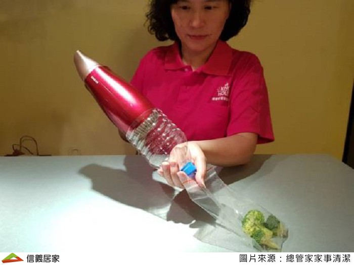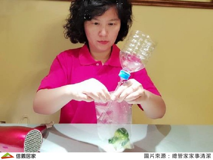 組合完成後,套在吹風機後端,吸管處插入裝了食材的夾鏈袋,將夾鏈袋密封只留吸管可穿入範圍,此時打開吹風機冷風,勿使用熱風,即可看到夾鏈袋有明顯吸真空效果!