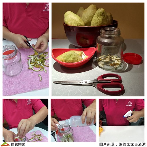 柚子皮切塊放入一鍋煮沸的水約10分鐘後靜置放涼,將柚子皮水倒入噴嘴瓶即可當天然清潔劑用,擦拭家具或拖地都能乾淨去污還留下淡淡香味~也可倒入浴室排水口消除惱人惡臭!