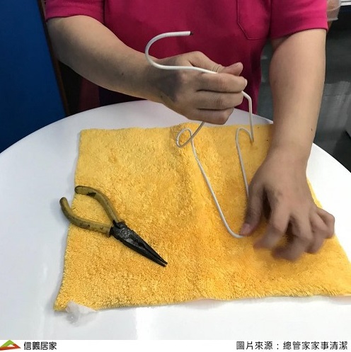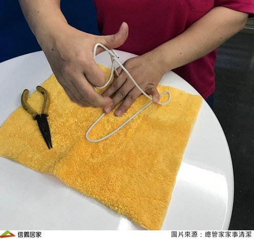 1.衣架兩端約15 公分處用尖嘴鉗摺成直角。(可以借力箱子或家具)