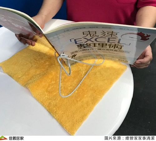 2.衣架部分也往下摺,兩端立在桌面上,掛勾往後摺,書本就能立放在衣架上。