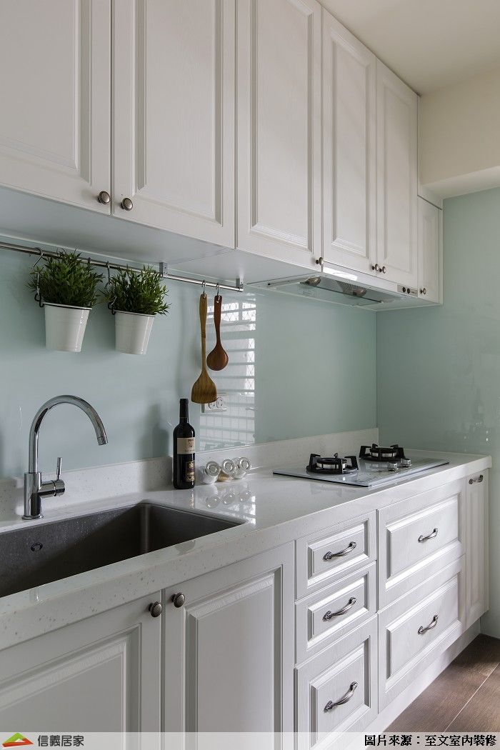 帶有古典設計之美,線板裝飾也是美式居家很常見的元素,不過不像傳統的繁複堆疊,經過簡化的線條,反而會讓空間更有立體感。運用在廚房天花、牆面邊角及廚具櫃體上,增加視覺細膩度,多了一絲優雅的味道。