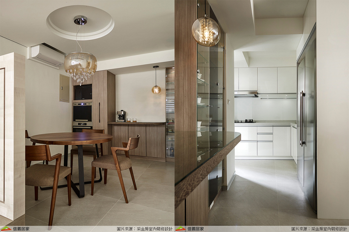 ▲愛下廚的媽媽始終有個開放式廚房夢,因此設計師運用<牆線的比例重新分配>輕鬆劃分出半開放式廚房,善用電視牆後的用餐區,沿著牆面做出吧檯、電器櫃,連超大冰箱都能無痕置入。