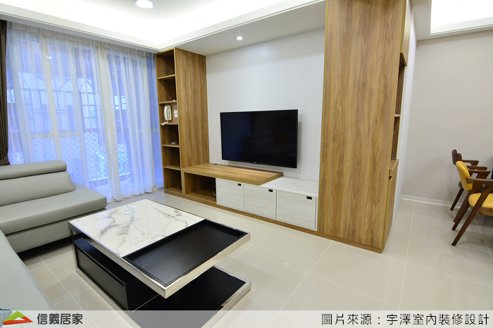 ▲為了營造現代簡約的俐落感,設計時將天花板改為能配合間接照明及省電嵌燈,地磚使用大片大理石,拋光效果讓整體看起來更寬廣舒適,另外特別貼心設置系統櫃放置一家六口的物品,讓全家大小放好放滿!