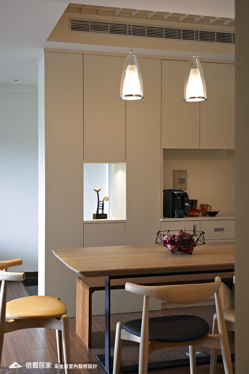 透過鞋櫃與餐櫥櫃結合的雙面櫃體,十分受到居家設計的歡迎,鏤空置物規劃,不但讓兩個空間可以彼此透光,也有展示作用。