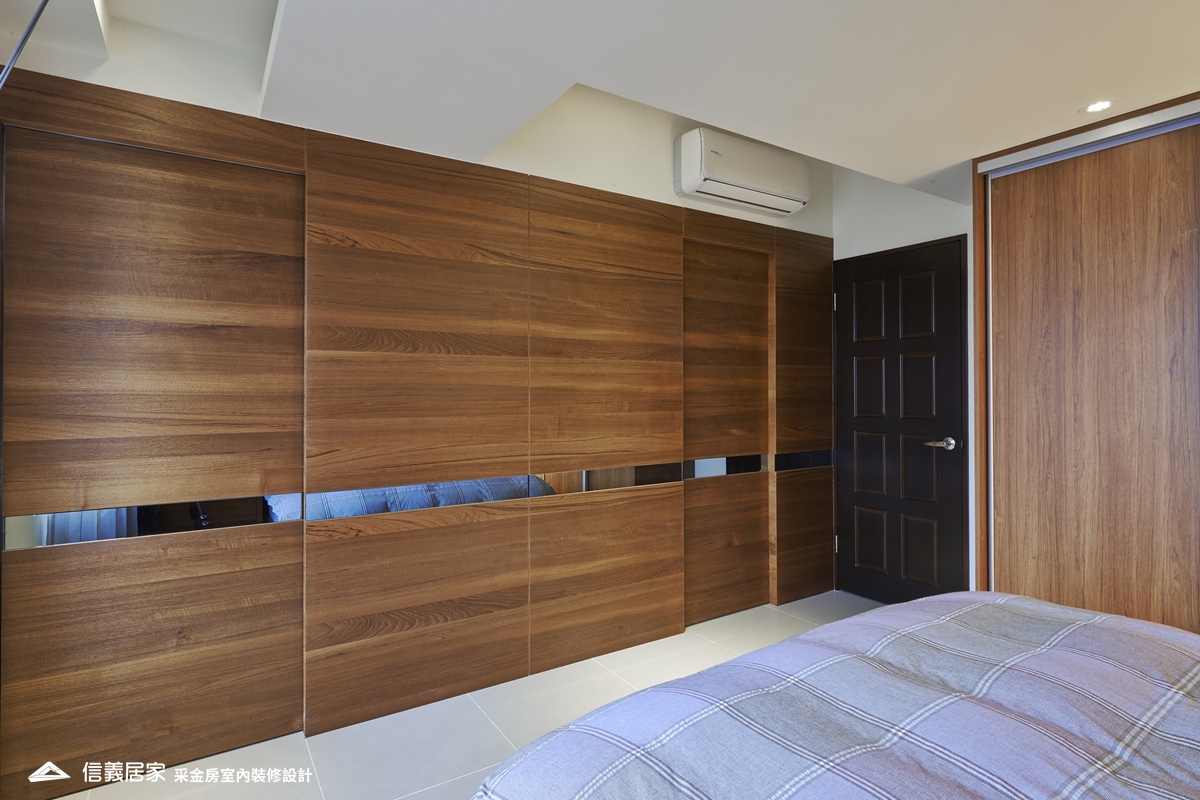 隔間牆面使用實心磚牆。同時將床規劃在遠離走道那一側,中間用衣櫃區隔,以杜絕公共空間的聲音傳遞。在門邊施作隔音條,讓聲音不容易透過細隙進來,保持房間的寧靜。