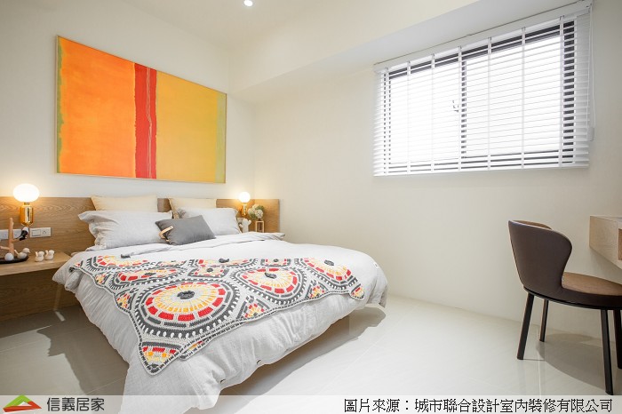 ▲想要活潑又中性則可考慮大面積花紋床單,局部紅色點綴也能帶出熱鬧感,枕頭套建議使用相近的單一純色系,可避免過多色彩、紋路的凌亂感。