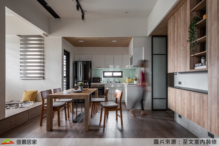▲淺咖傢俱、搭配木質櫃體,恰好與整體空間色調相呼應,自然光的透入更有柔和室內光景的效果!