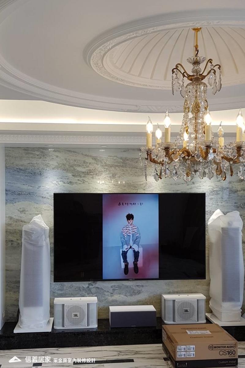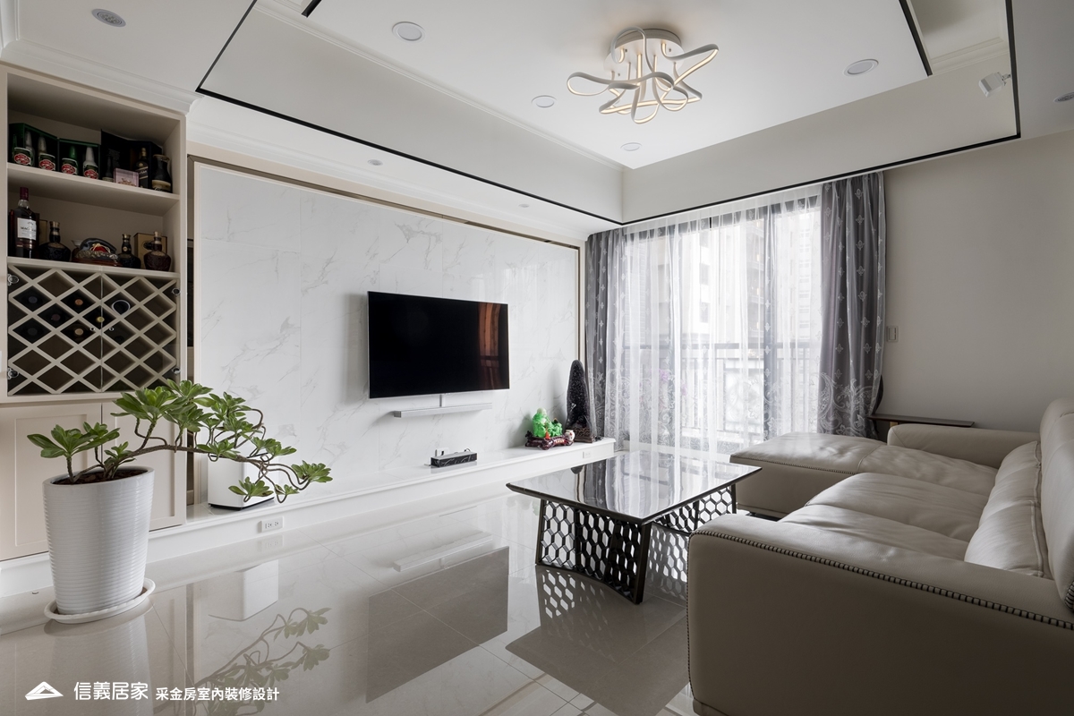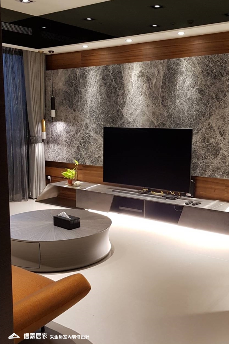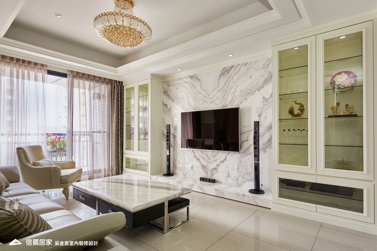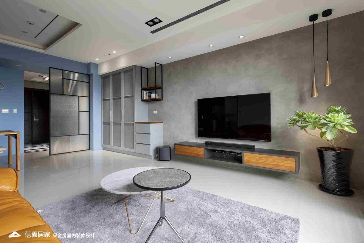 到底客廳面積要達到幾坪才會舒適?其實並沒有準則,以采金房設計的習慣會先拆解空間裡的元素,例如以客廳來說,一般居家配置會有沙發、放置電視的電視牆及茶几,審查必要條件後,再扣除合理動線,將行經寬度控制在90公分左右,含行走及蹲下開電視收納櫃抽屜,可以發現一般客廳寬度最好不要小於300公分最為適合。