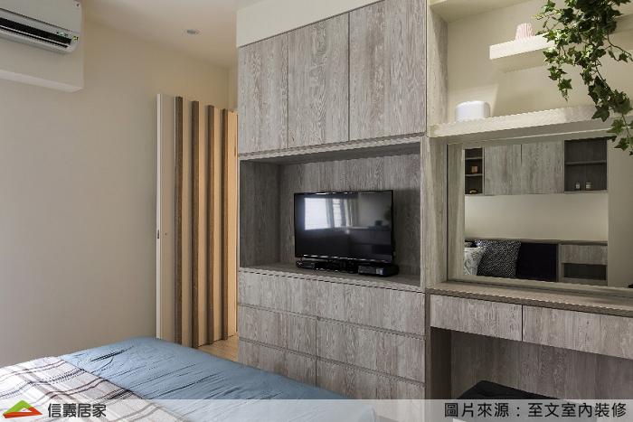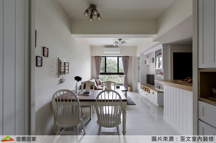 ▲小宅設計中視覺放大是關鍵!居家風格可選擇淺色系如:日系風、北歐風、現代風等。此案的日系鄉村風就是非常成功的代表,以奶油白貫穿場域淡化小坪數的擁擠,電視櫃向下收納時使用線板櫃體散發濃濃鄉村味,上層則利用隔板做成展示架延伸收納,使原先白乎乎的牆面多了一抹元氣。