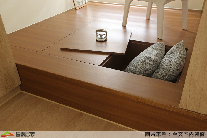 ▲地板架高後變為隱藏式的收納櫃,完美執行向下收納的高效能!新婚時可用來收納家用工具或棉被,當有寶寶時也可放玩具及冬季衣物,不論有多少雜物通通踩在腳底下,眼不見心清淨。
