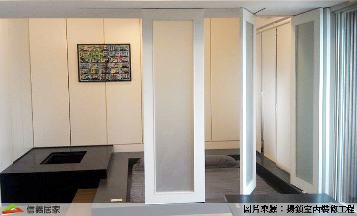 ▲忍者隱身術第二招:用隱藏式門板,創造一屋多用的設計,設計師運用此招術俐落破解公私領域的劃分,當拉門收合時,公共空間可延伸至臥室處,通透感門板讓視覺更為開闊;拉門展開時,私人空間隨即產生,即使有訪客也不怕被打擾。