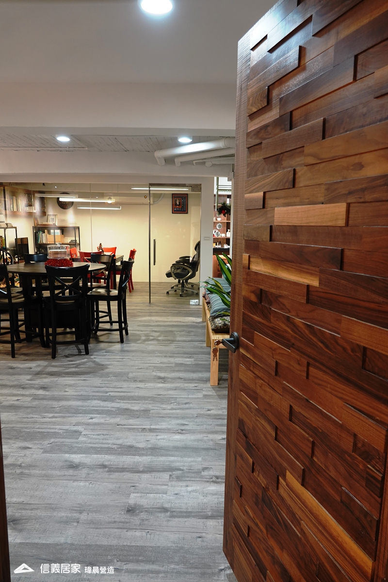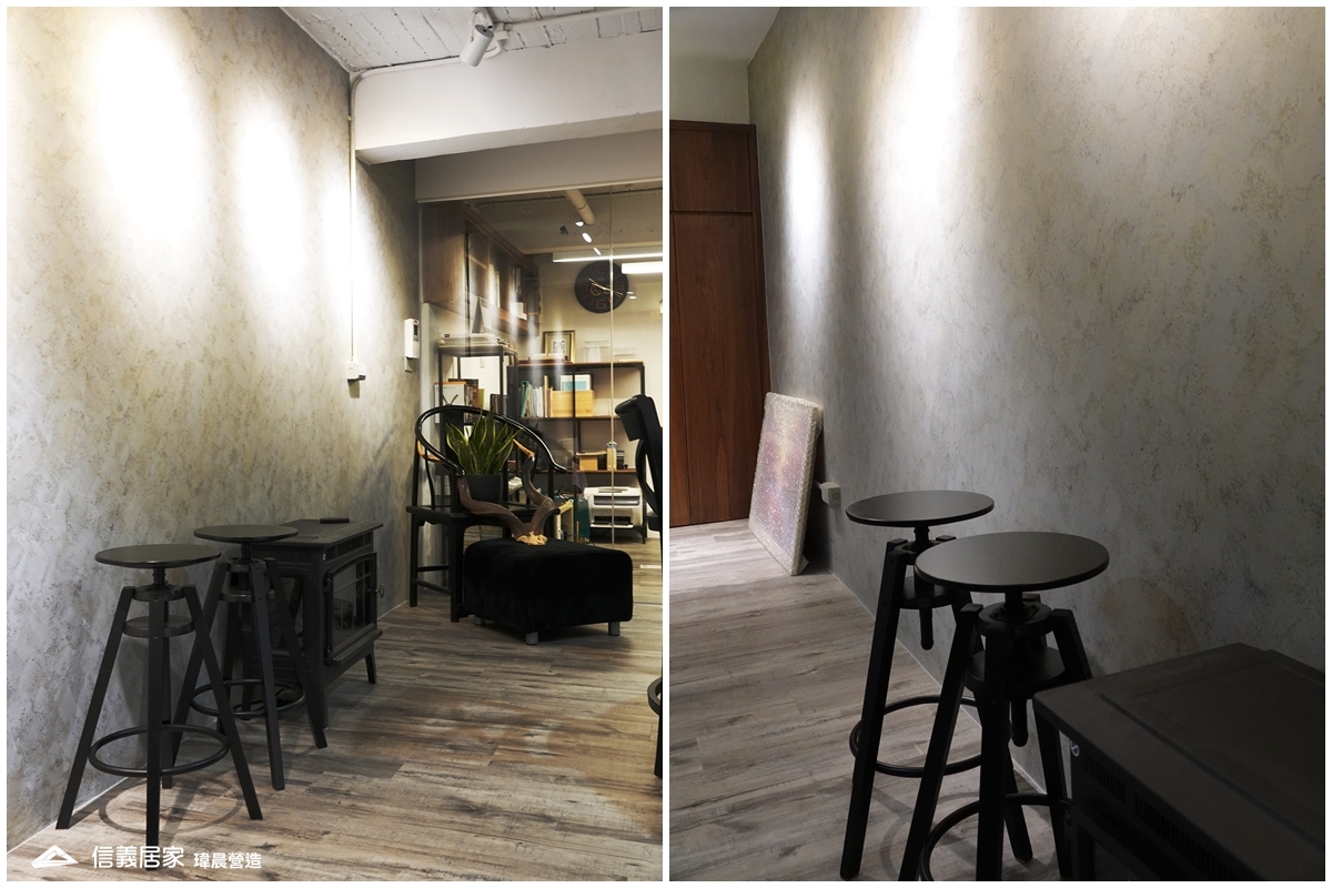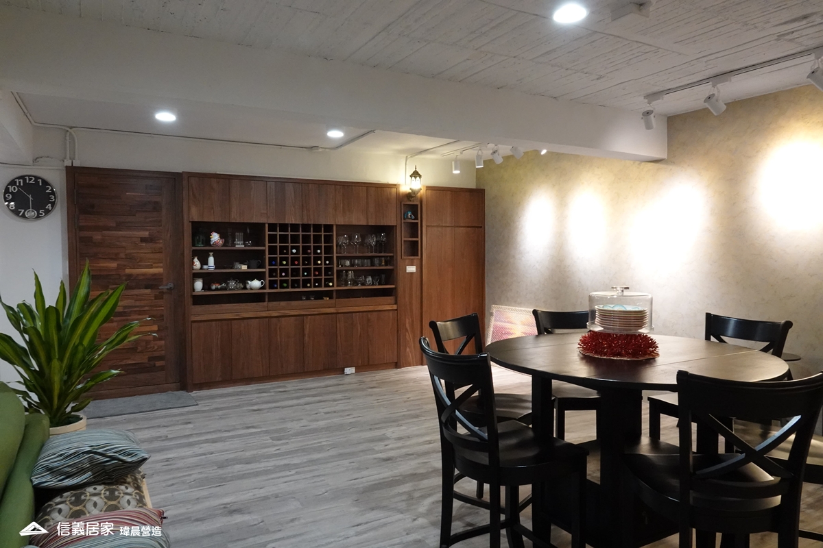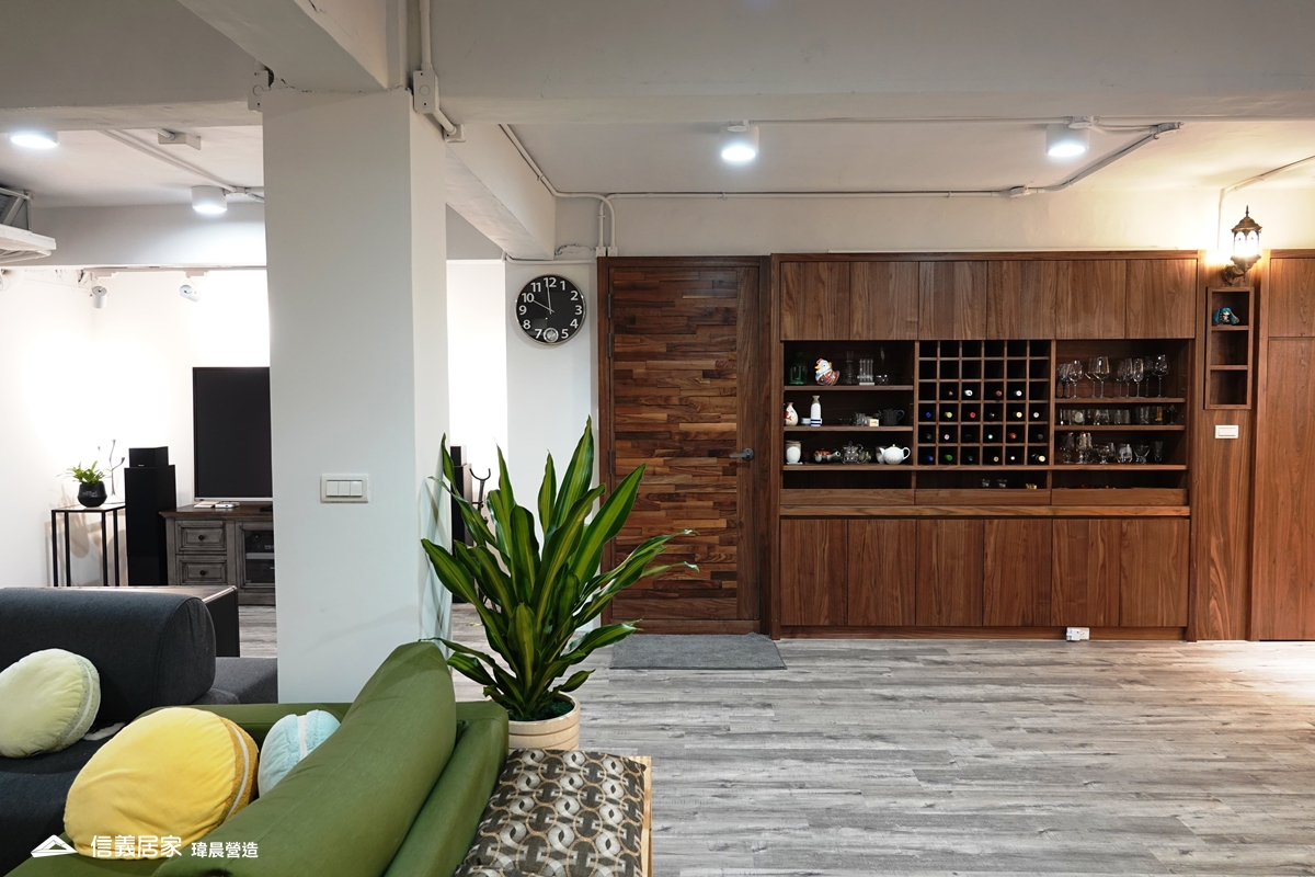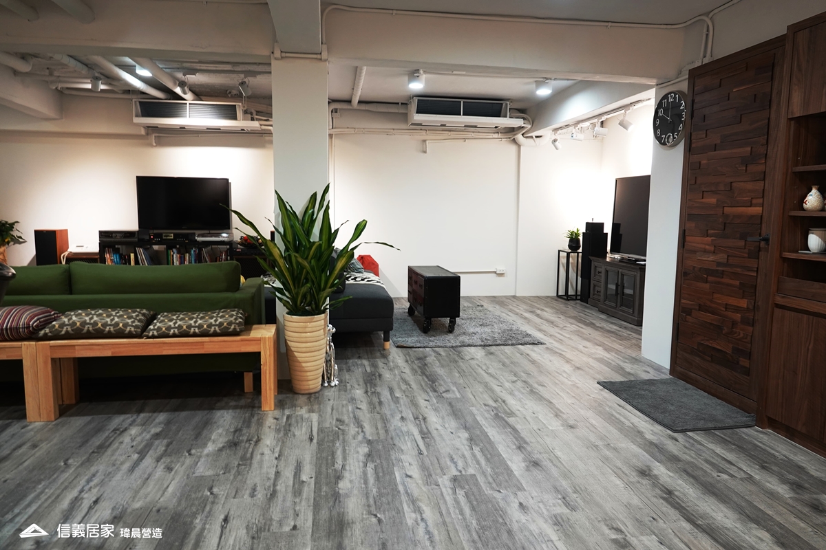 陳先生喜歡木地板的視覺效果,考慮到地下室的潮溼問題及清潔便利性,我們選用SPC木紋卡扣地板來裝飾地面,它完全不怕潮濕、面層有耐磨效果,非常適合這個環境使用。圓桌後方的玻璃隔間內是雪茄室,享受雪茄的時候可以與外面的朋友互動,全熱交換機以及獨立強效抽風機讓嗜好不造成別人的困擾,陳先生說這是他最喜歡的小空間!