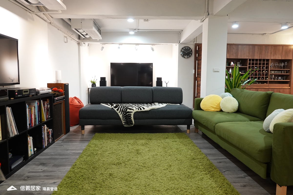 ▼大門左側的第一個沙發區是陳先生的遊戲區,一個人在秘密基地的時候可以舒服的打電動,享受一個人的快樂!雙面使用的沙發讓兩個視聽區聯結在一起,旁邊的沙發區可以讓七八個人一起歡唱KTV,或者三五好友一起喝著威士忌聽著老歌,回味二十年前的青春!一個專屬包廂的概念!