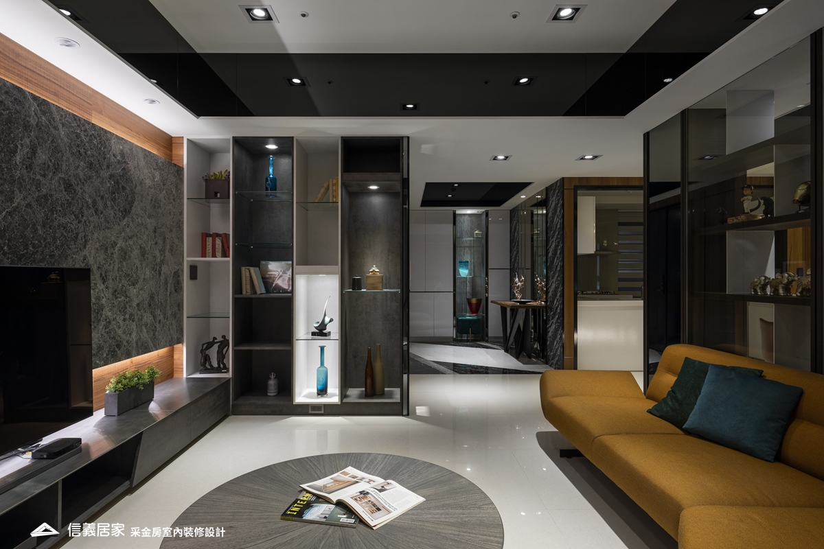 飯店風格講究簡潔線條感,因此在客廳的電視主牆上運用大片黑灰色大理石與鐵件電視櫃的搭配,自然融合出時尚機能都兼具的氛圍,而大理石上自形成的亂紋線條在燈光投射下,形塑空間流動感。