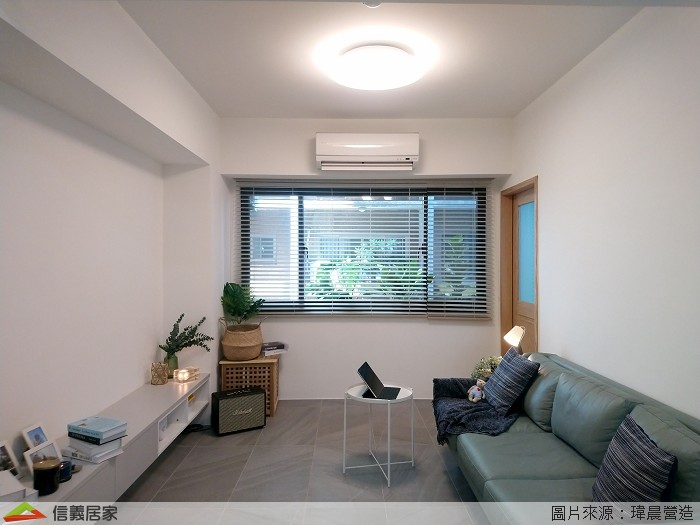 買老宅時多點用心觀察,有些仍具備良好採光的優勢,透過設計師的巧手規劃將日常需求、建材、選色等一併揉合就能有驚人的亮眼效果!考慮到有長輩同住因此將地板鋪上淺色系磁磚配上純白櫃體,使光線進入空間後能快速提升明亮感也更加安全,電視牆選用墨綠色主牆與灰階系統櫃,多層次的堆疊聚焦視覺,宛如新成屋的樣品屋設計感十足!