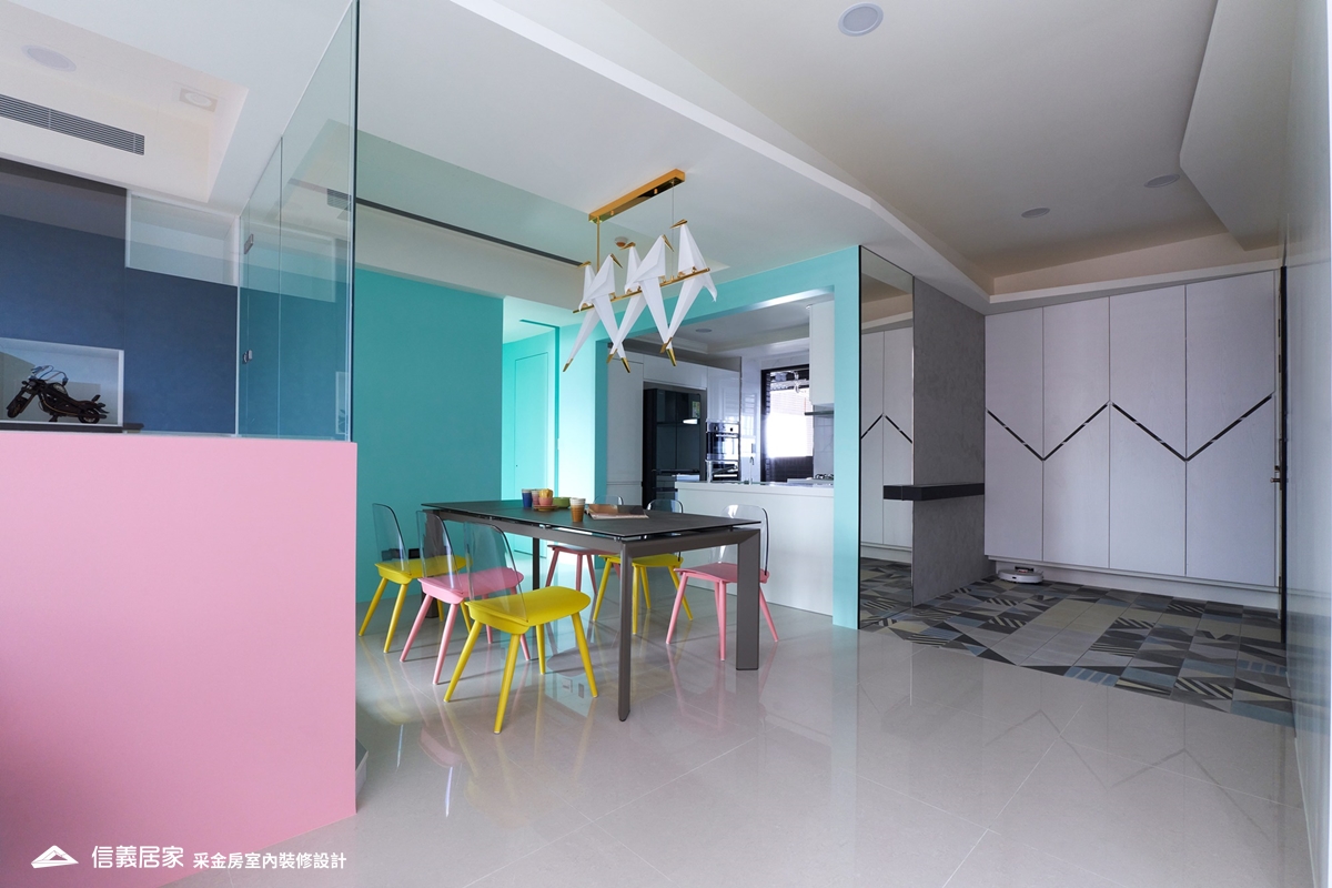 開放式設計的公共場域,無論是運用玻璃隔間做為客廳與書房的劃分,或串聯粉色餐廳及藍色客廳的開放式廚房,都讓空間明亮度再提升,而餘波蕩漾的湖水綠餐廳則為夢幻蒂芬妮藍過渡公私領域的橋樑;連玄關櫃都不忘採用鏤空設計隱晦帶入電影中的光劍元素。