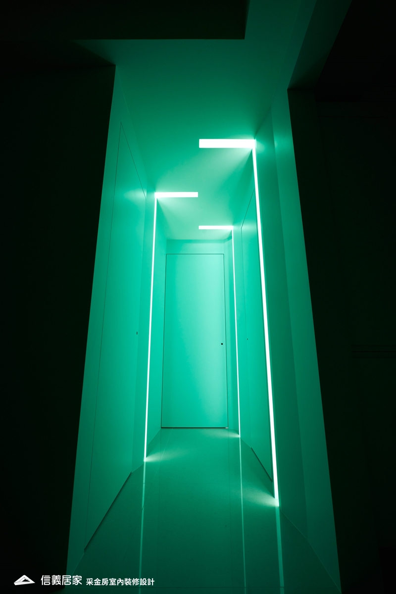 為因應男屋主對科幻電影的喜好,因此利用通往私領域的廊道空間,在牆面及天花隱藏LED光帶,打造出一個如同電影場景般的太空戰艦光廊,在螢光綠的映照下不禁想起絕地大師金魁剛和尤達手中的綠色光劍,完美融合男屋主的科幻夢想更幻化出和平無爭的空間想像。