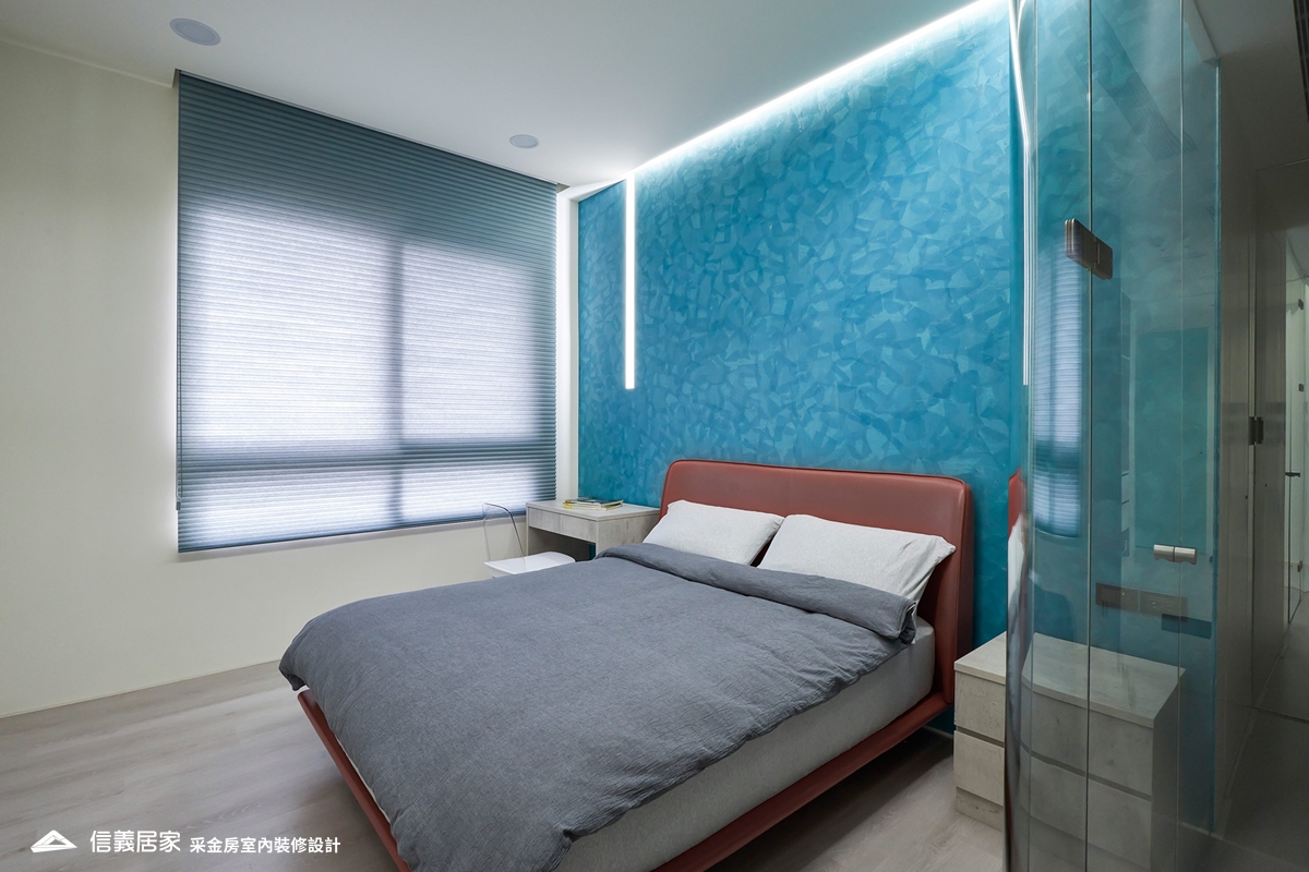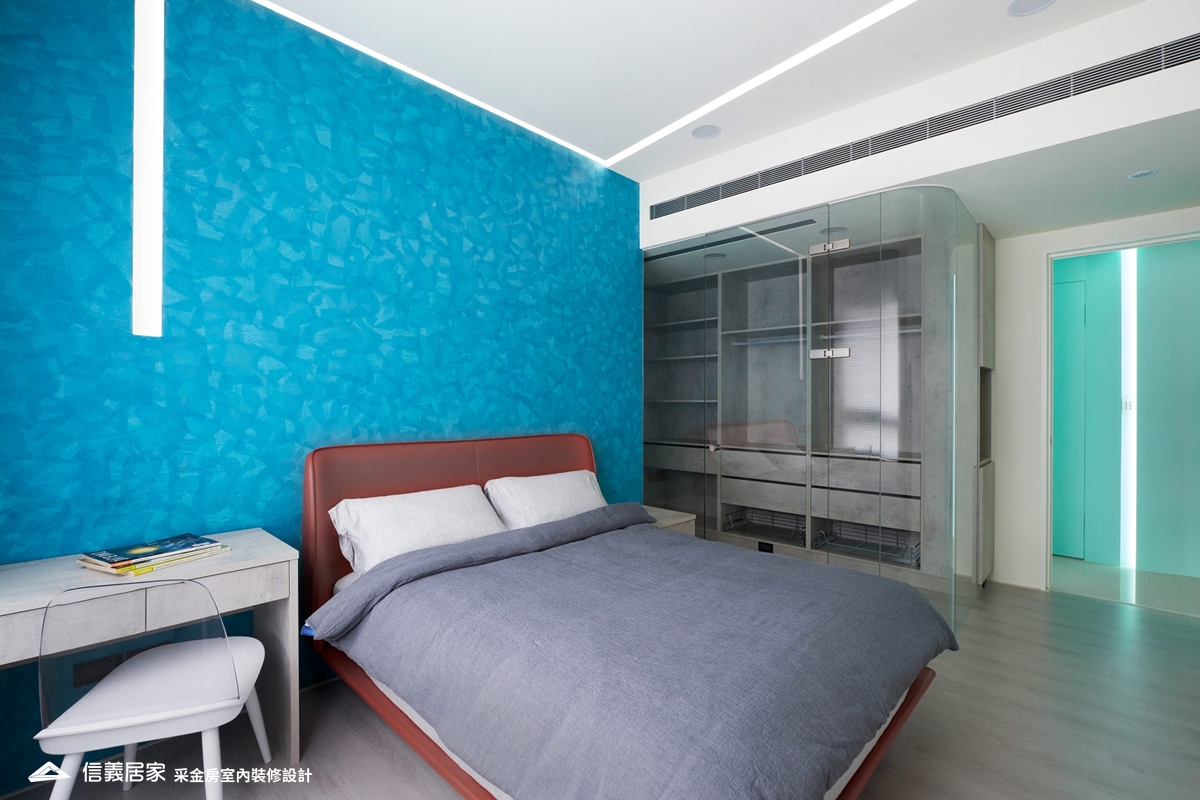以《星際大戰》歐比王及大反派帕爾帕廷的孫女蕾伊的藍色光劍為主色調,將藍色光帶隱藏在床頭主牆及天花,營造出希望、冷靜與智慧的意象,而馬來漆紋路更為空間添加一點層次感。