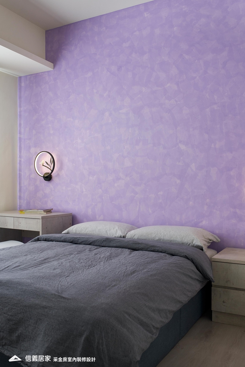 由於不希望空間太過冷冽,因此客房以紫色為主調,來呈現空間的浪漫及親和感。仔細看床頭燈罩內,有著小鳥站在枝頭上透露中式元素,在星戰系列電影中,只有雲度手持紫色光劍,代表駕馭黑暗與光明,勇敢的犧牲壯烈,是不是符合紫色溫暖又無懼的意想呢?