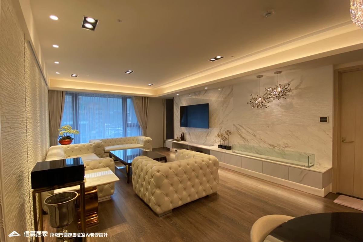 電視牆面與下方櫃體檯面採用同塊石材設計,與電視櫃相近的紋路色系互相映襯,巧妙放大主牆面延伸視覺效果,由木質地板與坎燈透出的射線,柔和客廳氛圍,透露出屋主典雅細緻又大方的品味。