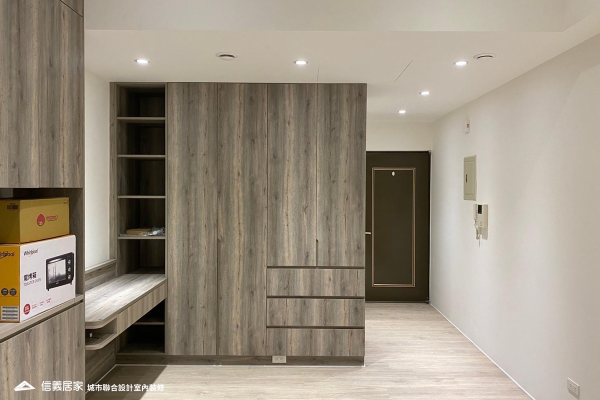 城市工程設計建議,坪數不大的建物應避免過多的色系造成視覺凌亂,簡單白牆設置兩座頂天的系統收納櫃,系統櫃外觀採櫟木皮呈現爽朗乾淨,並在床頭中央取開放的設計,適合睡前置放眼鏡、水杯或書籍等小物,滿足夫妻不同的需求。