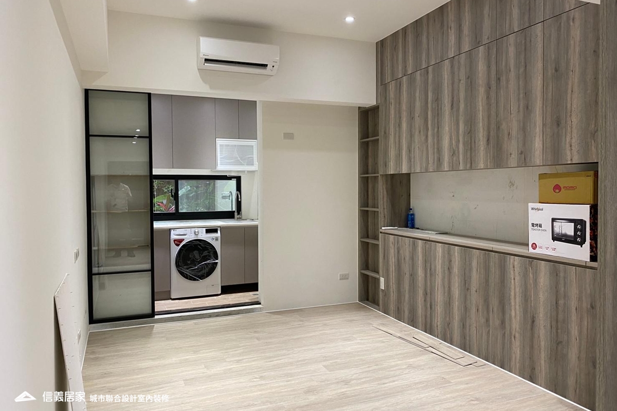 超耐磨地板及PVC地板是選購木地板時最常見的選項。此案使用的是晶鑽SPC超耐磨地板,方便清潔保養及耐磨耐刮,無論是移動家具或寵物跑跳都不必擔心磨損地板。木紋外觀與實木地板相近,亦可營造出溫暖的空間感。