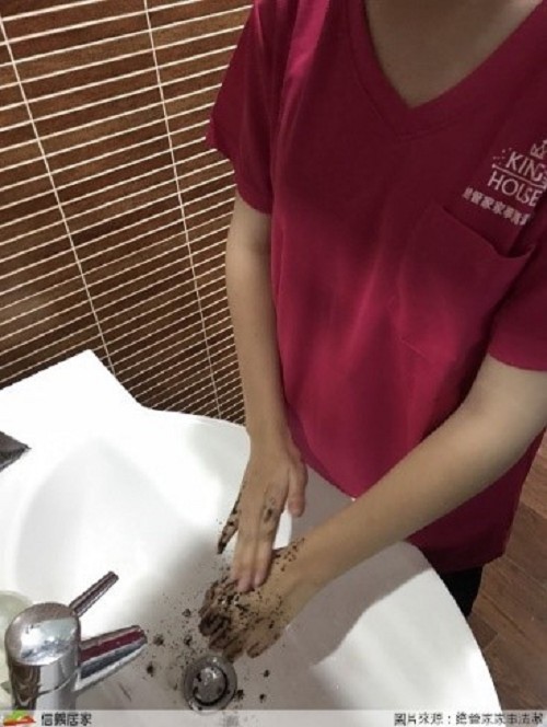 >手上倒上咖啡渣,依一般洗手流程輕鬆搓揉去除怪味~