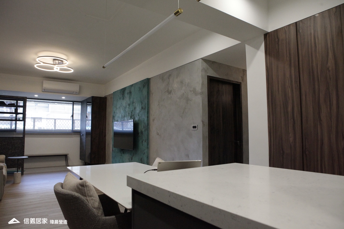 作為門面的客廳牆面使用特殊塗料藉由職人手作留下獨一無二的痕跡,使整個家居表現出截然不同的個性,一個屬於都會男子的洗鍊沉穩,又帶著玩心的單身居所就此誕生!