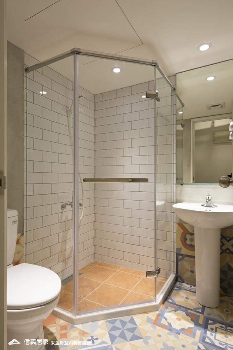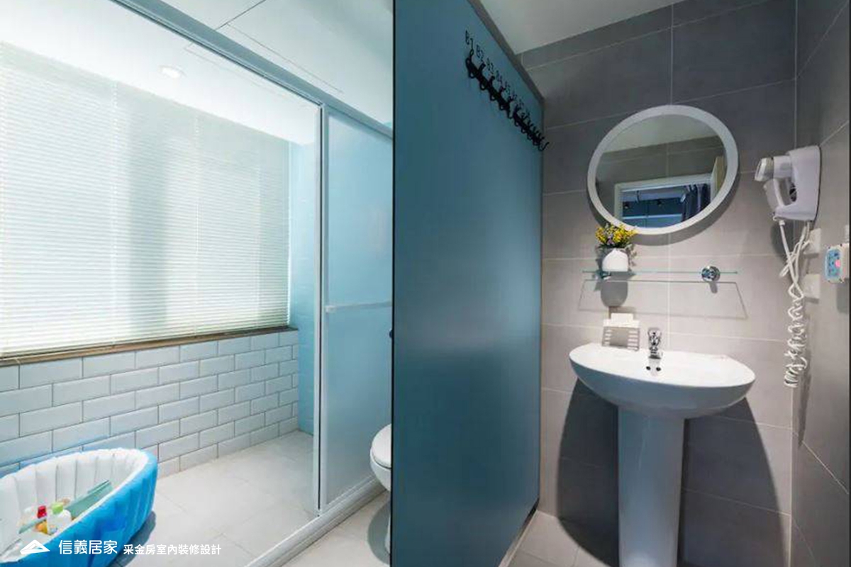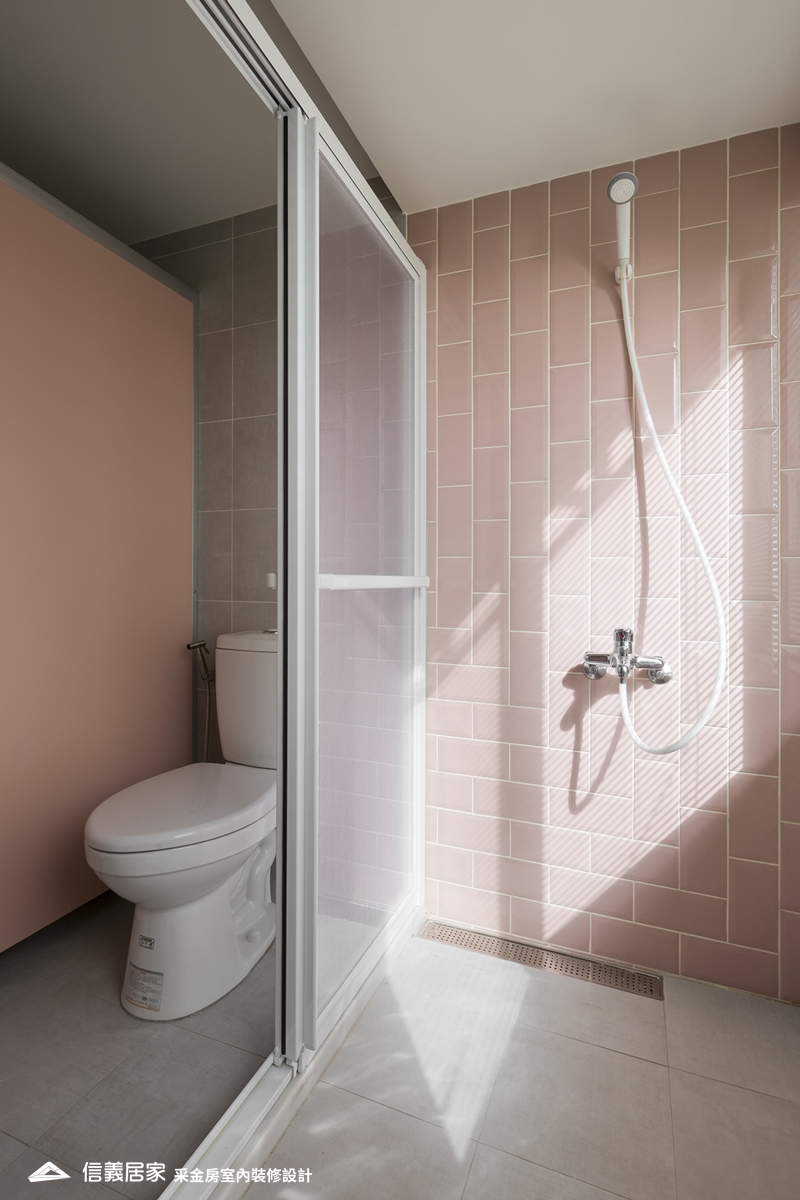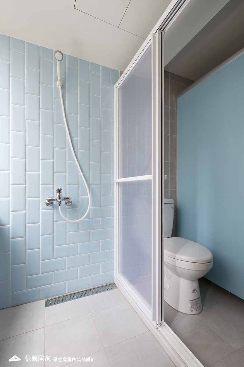 傳統觀念認為浴室小,容易發霉,因此應大量運用中性色彩的灰、黑、白,但事實上,運用明亮的色彩,例如藍、粉色系可讓衛浴空間煥然一新。若搭配有立體感的巧克力磚或鐵道磚,在光影變化下,如廁或洗澡更能放鬆心情。