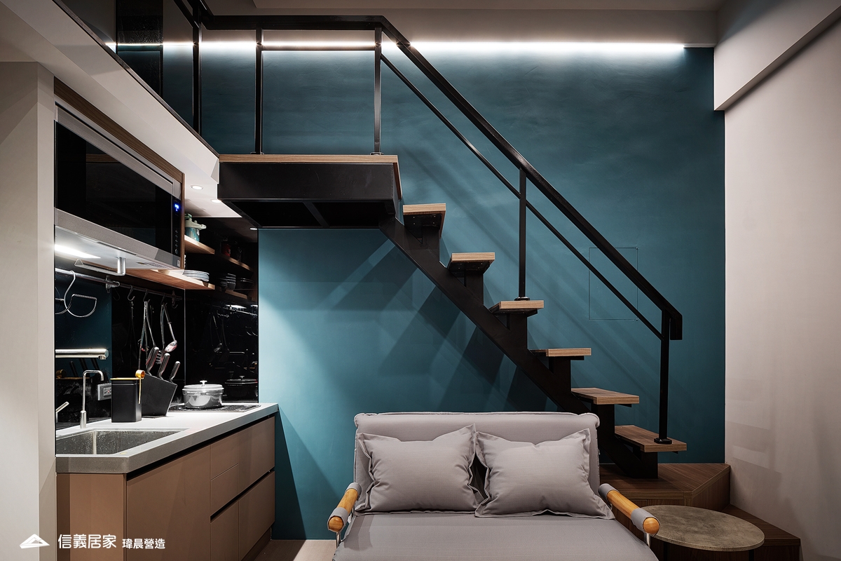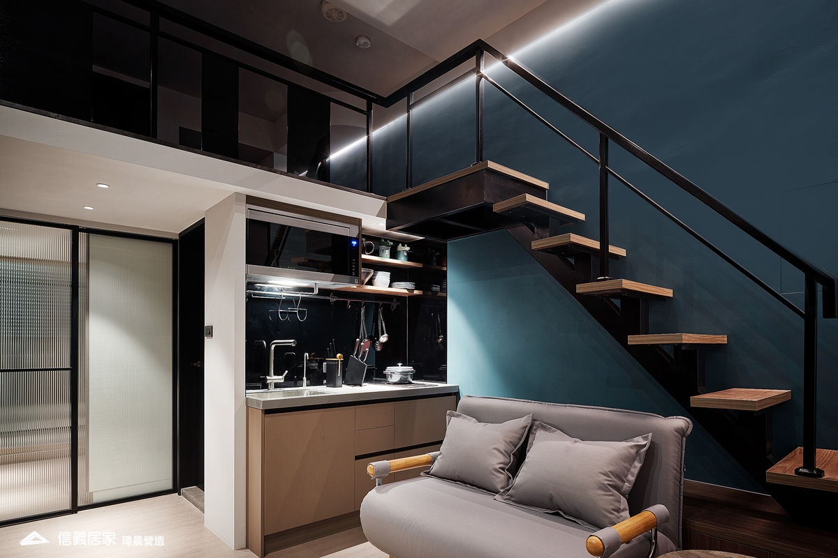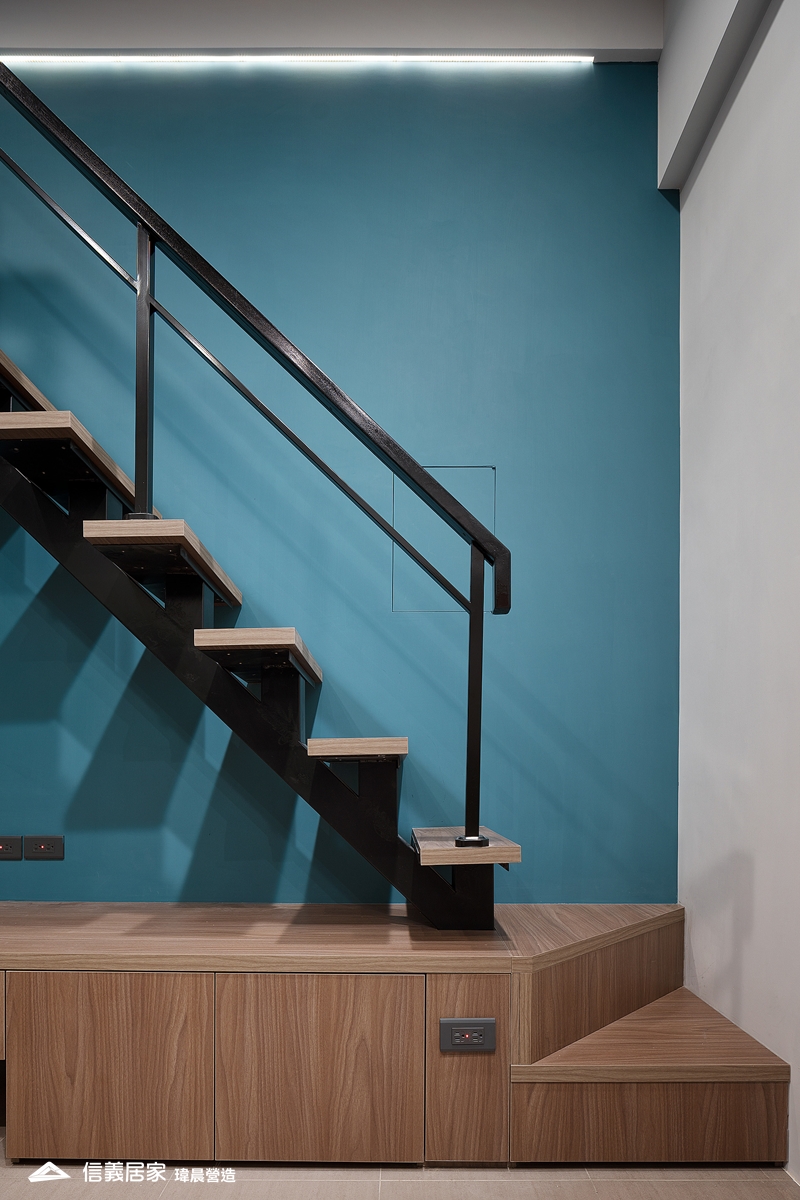 精心設計的鏤空平面梯級,襯著莫迪蘭色調霧藍色彩,多層次空間感締造風雅,恰到好處打上的燈條光芒,讓光影,傾聽不平凡,訴說家的故事。