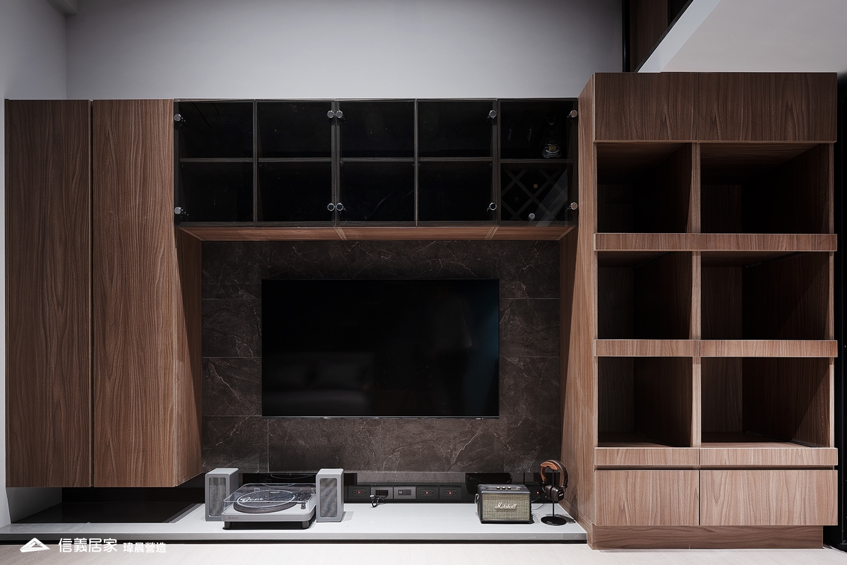 目線一轉,客廳的另一側安放經典胡桃紋客製化組合櫃,家居雜物輕鬆收納。