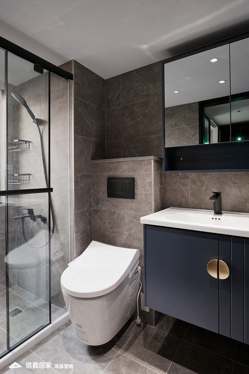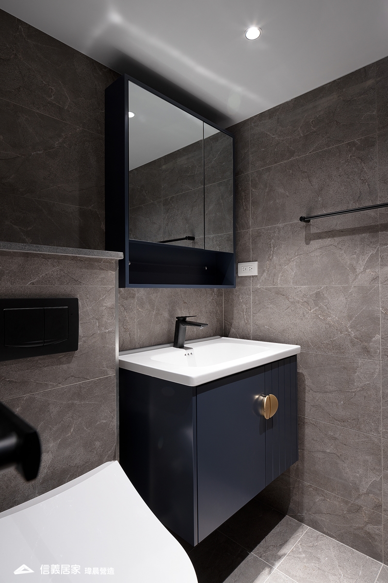 進口石材打造精品沐浴空間,洗滌心靈放鬆身心。鐵灰與純白配色洗手檯面奪目不失簡約。