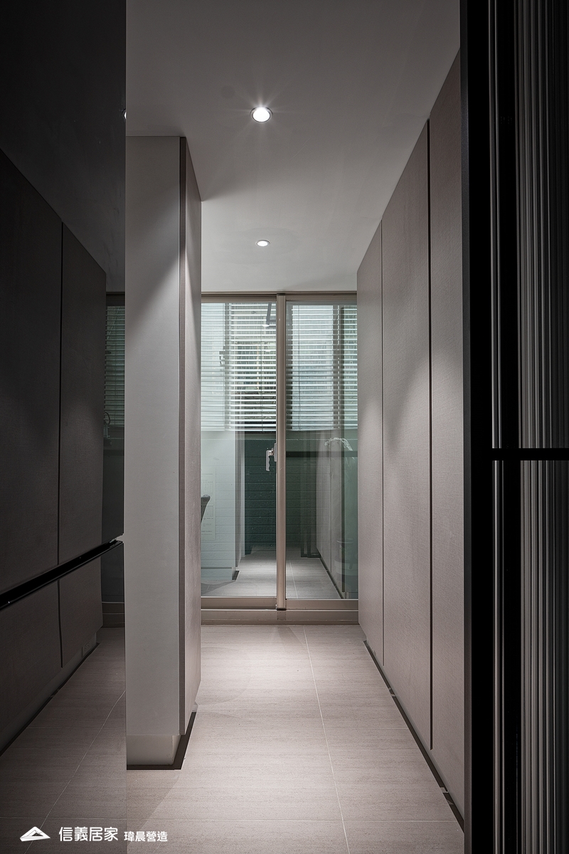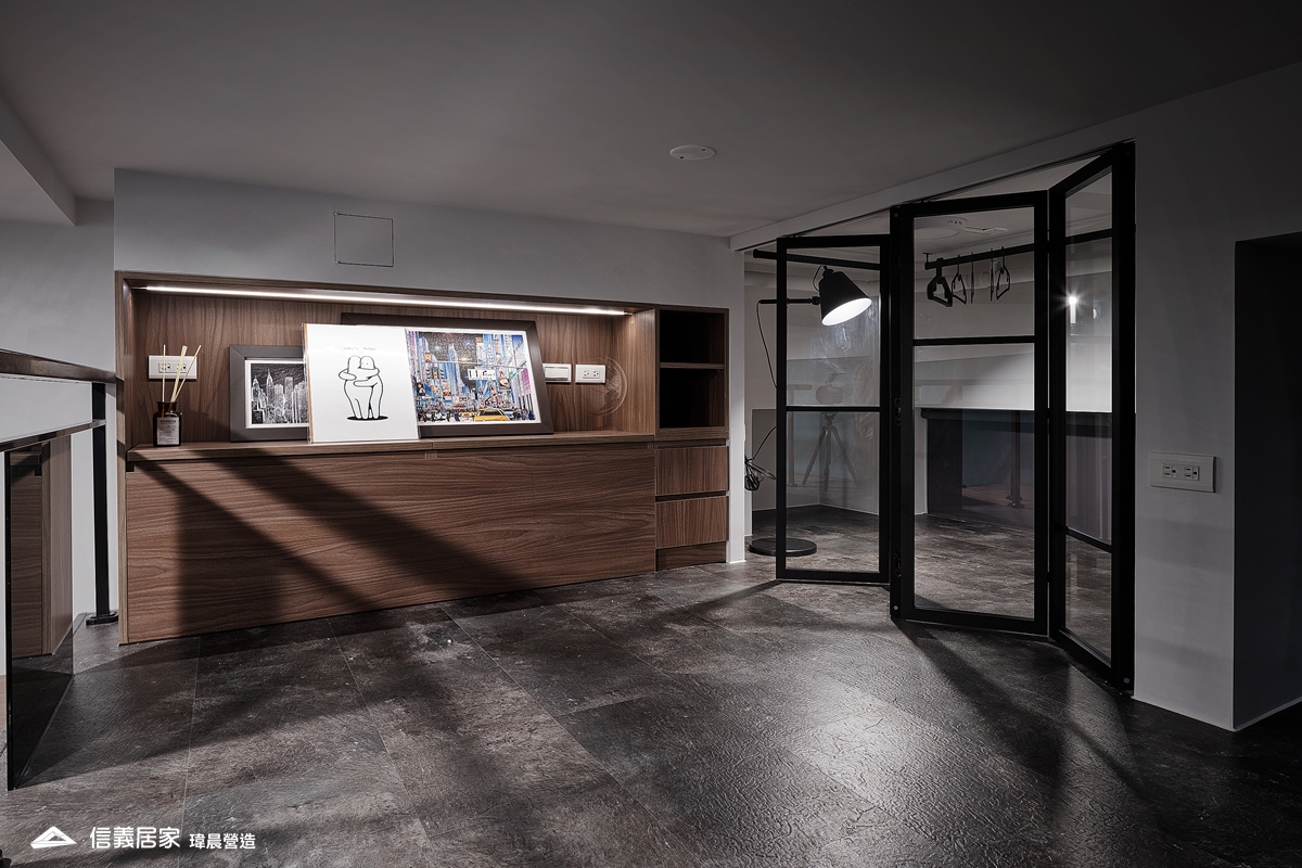 客廳背牆的沉穩冷色調,打開家門如同走進與外界不同的光影空間。
