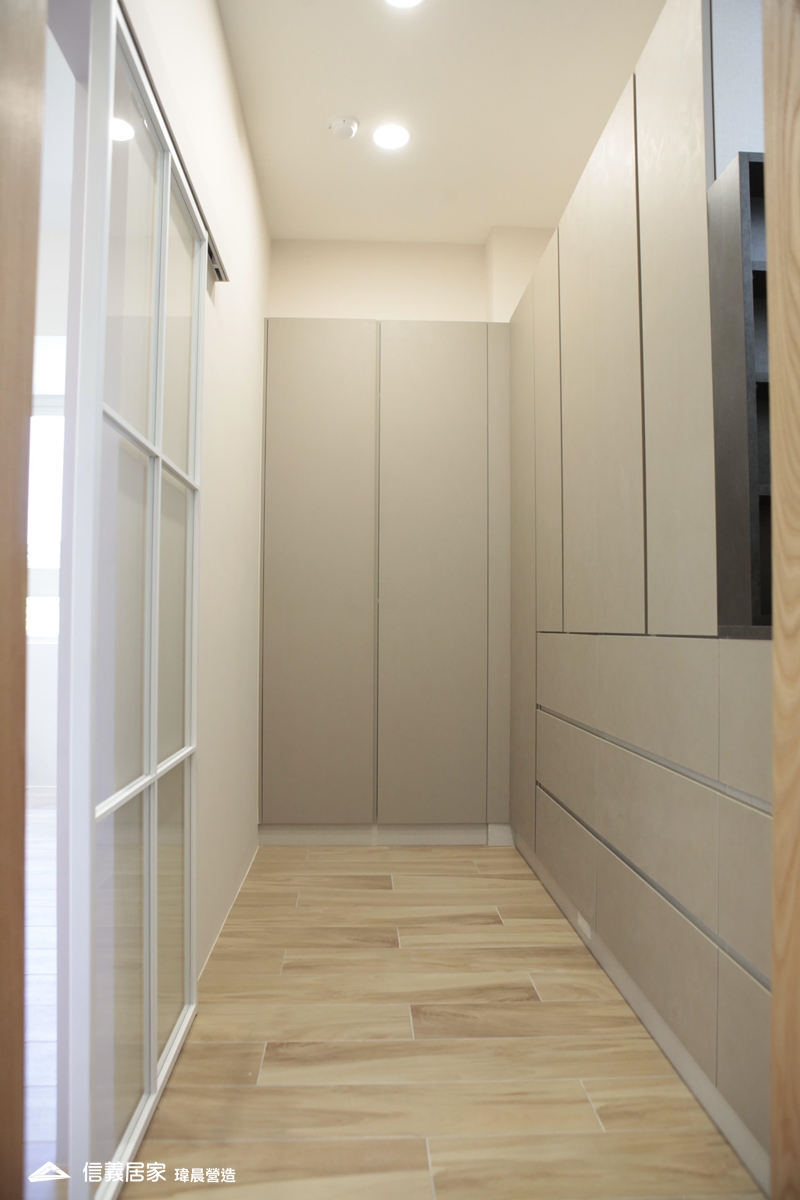 更衣室用奶茶色系的系統櫃搭配木紋地磚延伸空間感。