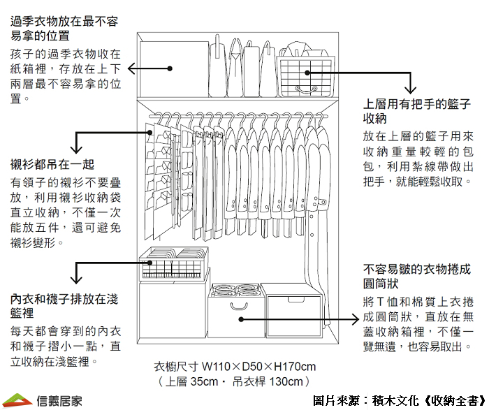 圖文提供/《一開始就不用收!家的最後一次空間收納課》收納觀念|不要小看衣櫃都差不多,選對衣櫃讓你輕鬆換裝,選錯衣櫃會天翻地覆出不了門。 重點在內部的吊掛、淺抽、深抽、層板,變化選擇多,如何選擇適合自己的衣櫃? 首先檢視衣物類型,是適合摺疊的多、還是需要吊掛的多?這決定櫃內要以吊掛還是以抽屜為主,並