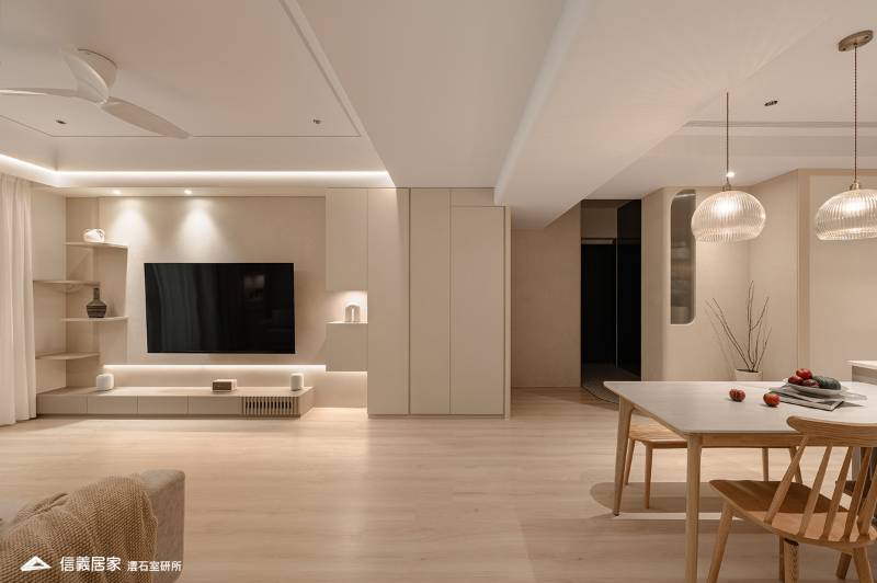 以韓系奶油風打造柔和圓潤的家,奶茶色系串連全室,搭配弧形線條、柔光與木質營造溫馨氛圍。玄關以水磨石與小冰柱玻璃迎賓,客廳結合貓跳台、隱藏收納與情境燈光,塑造舒適日常。圓形拱門後藏步入式儲藏間,提升收納餘裕。餐廚區以L型動線、吧檯銜接餐桌,整合冷凍櫃與電器櫃讓料理更順手。主臥以柔色搭配衣帽間