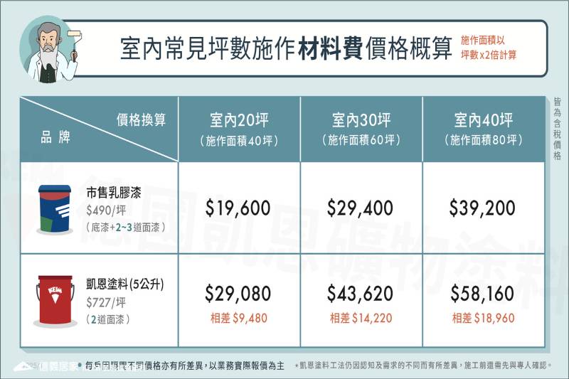 使用凱恩礦物塗料的材料費,沒比乳膠漆貴多少!