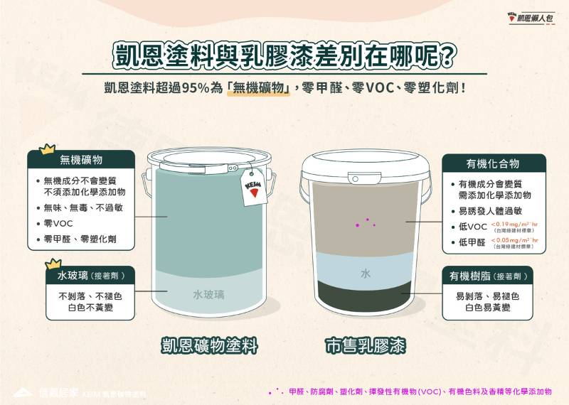凱恩礦物塗料為零甲醛、零VOC、零塑化劑的無毒塗料。塗料成份萃取自天然礦物,以矽酸鉀溶液、天然礦物添加劑及無機色料等黃金比例調配組合而成。過程中不需加入任何人工化合物,所以才能夠完全無毒,無味。施作時完全沒有味道,亦不釋放有害物質,所以不用擔心會對人體產生不良影響。