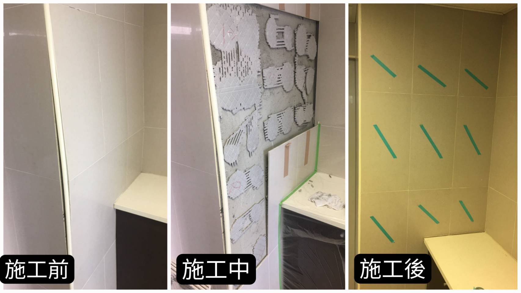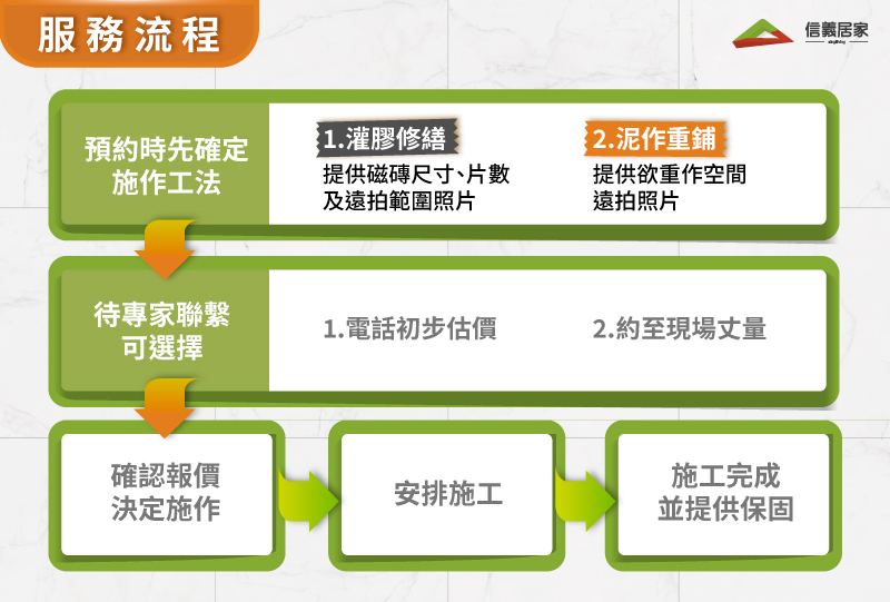 | 施工方法 | 創新磁磚修補工法 | 傳統土水施工 |