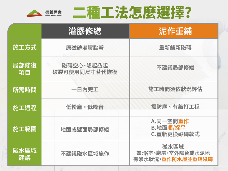 | 施工範圍 | 僅修補損壞磁磚,範圍小 | 需全部拆除,施工範圍大 |
