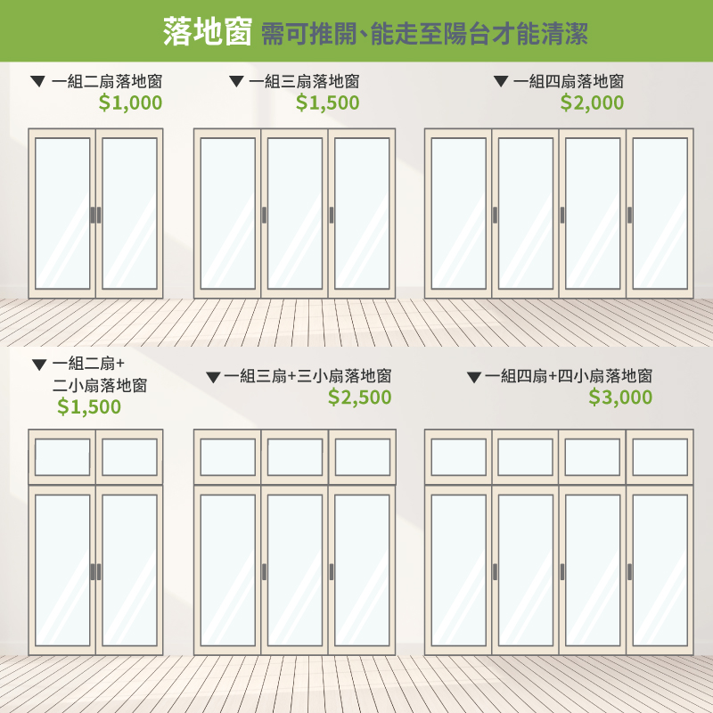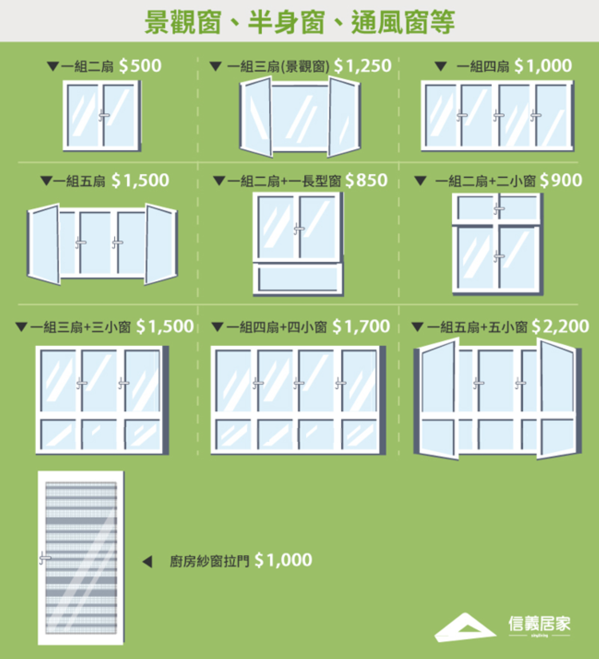 不同窗戶類型可自由選擇搭配,出工門檻$2,000元,未達門檻以$2,000計價 *2025/12/1至2026/2/15春節前服務期間,將酌收調漲費用,實際費用依廠商報價為準;付款方式則以廠商通知為主。