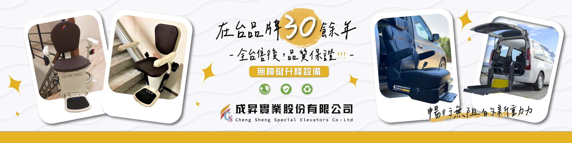 成昇實業專注無障礙輔具30餘年,提供樓梯升降椅、升降平台及汽車福祉改裝等一站式服務。從設計、製造到安裝維護,品質安心可靠,產品通過多項國際認證,廣泛應用於居家與公共空間,打造安全便利的環境。